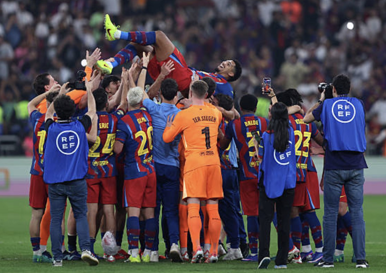 跳的不错!巴萨小年轻们在赢得西班牙超级杯后合拍跳舞